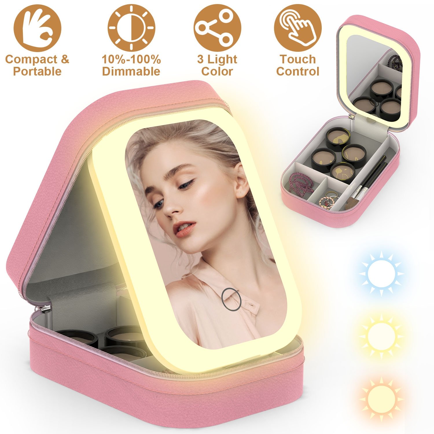 Home > Portable Travel Makeup Bag With LED Mirror Rechargeable Beauty Mirror With 3 Color Light Dimmable Brightness Waterproof Cosmetic Bag With 4 Compartmen