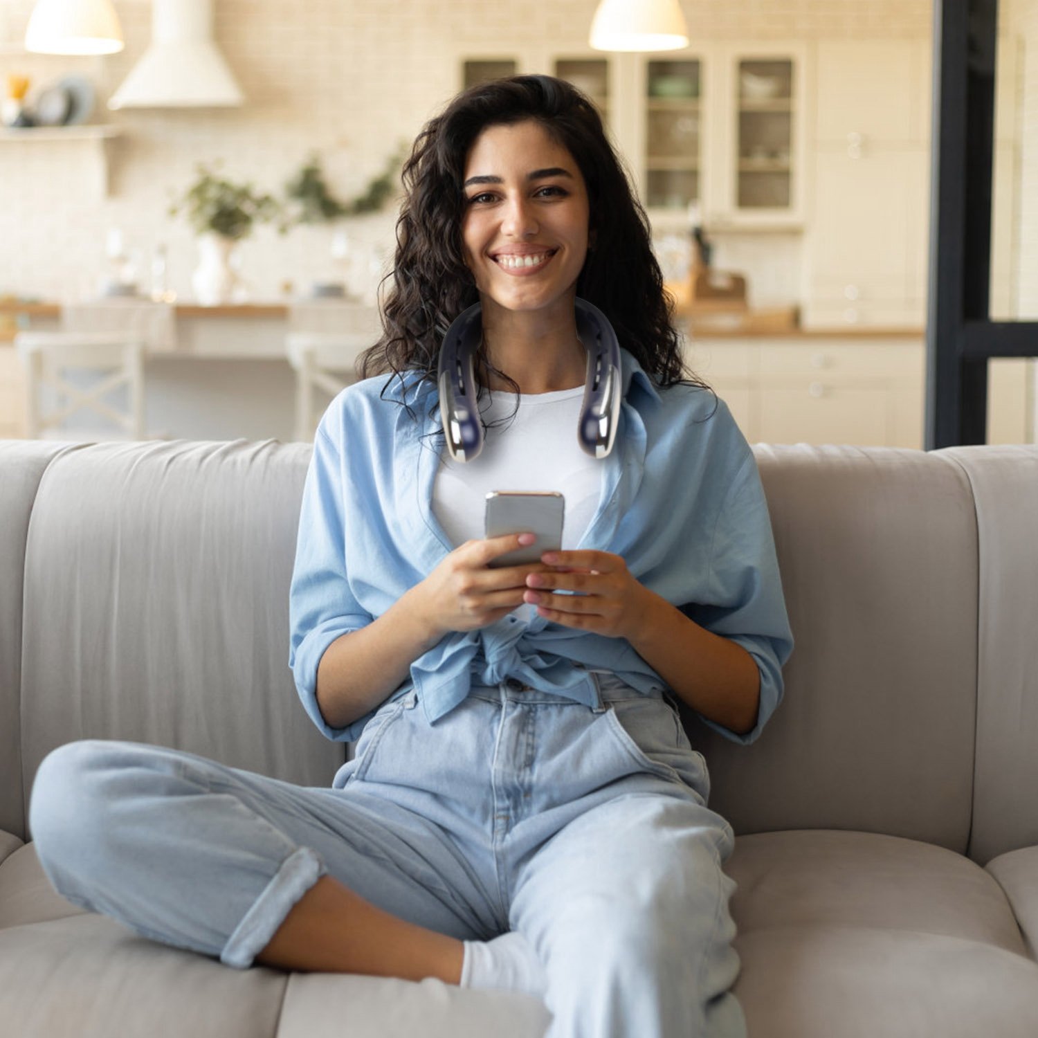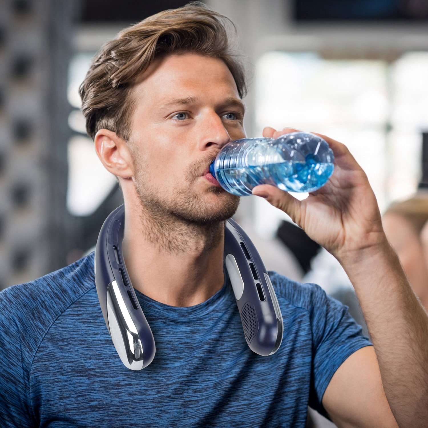 Simply wear this unique bladeless fan around your neck for instant coolness and hands-free operation in any situation. The innovative bladeless design is pintch-proof, safe for everyone. Come with 5 adjustable wind speeds and 360° all-around air flow, this portable neck fan satisfy all your demands. Powered by type-c rechargeable battery, it supports up to 6hours continuous blowing after fully charged. Lightweight and stylish design is definitely a perfect summer companion for home, office and outdoor activities.