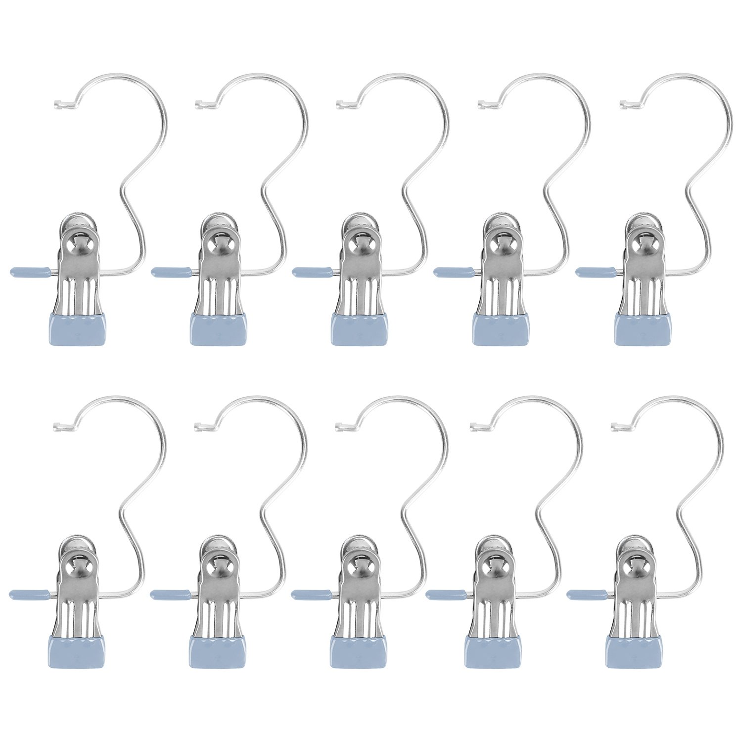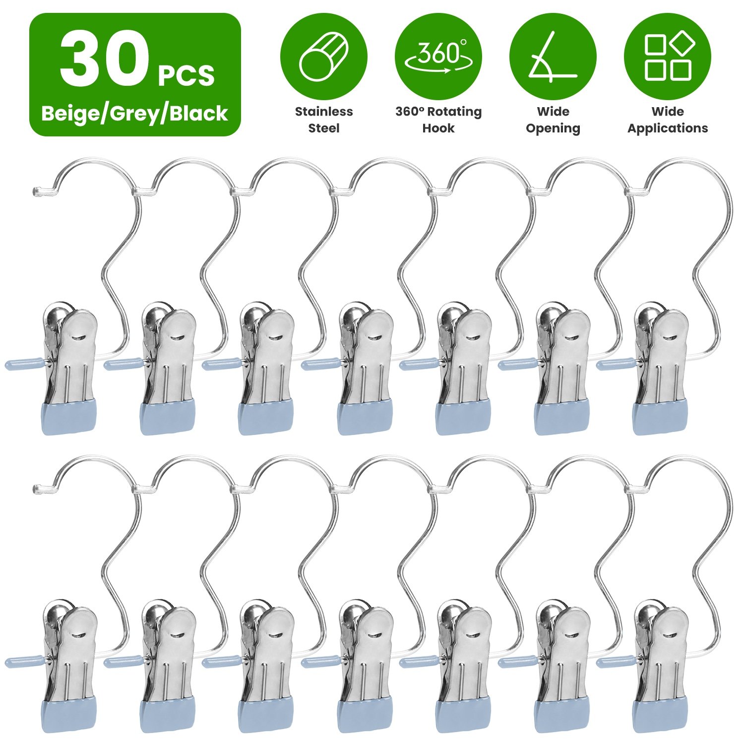 Your boots or clothes always leave a mark after longtime hanging? Try our 2 in 1 hanger clips! Constructed out of premium stainless steel and coated with rubber, our laundry hooks boast rust-resistant feature and are capable of hang your clothes securely without leaving marks. Sturdy enough to hold various clothes, pants, boots, hats, towels, socks, handbags, pillows, belts, snack bags etc., not easy to bend, deform or break, suitable for both dry and wet environments like closet and bathroom. In addition, you can have 360° rotating hooks and 2.5cm/0.98in wide opening clips at the same time, which can greatly help you organize your room and streamline your life with 30 handy packs. Must-have home essentials for clothes organization!