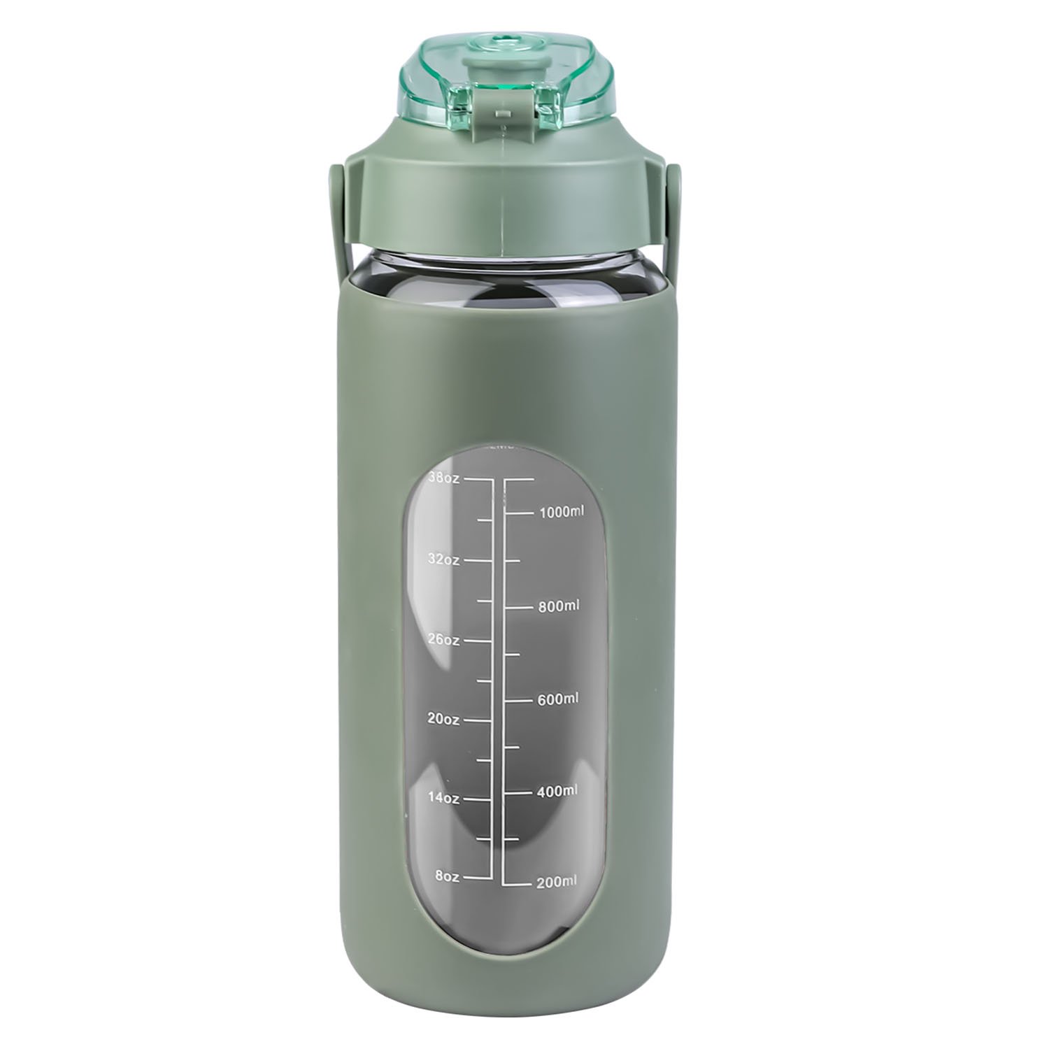 Are you tired of forgetting to stay hydrated throughout the day? Look no further than our motivational water bottle! Comes with timer markers and and precise volume on the side, helping you track your water intake with ease. With its large capacity(32Oz or 64 Oz), you can refill the sports water bottle up less frequently and keep yourself refreshed all day long. Made of high borosilicate glass, suitable for both warm and cold beverages, heat-resistant, dishwasher safe and healthy to use. Slip resistant with silicone sleeve and easy to carry with a built-in handle. And for added convenience, it features a built-in straw, making it easy to drink water on the go. Plus, its stylish design and motivational messages will inspire you to keep pushing towards your health goals. So why wait? Invest in our water intake tracker bottle today and take the first step towards a healthier, happier you!