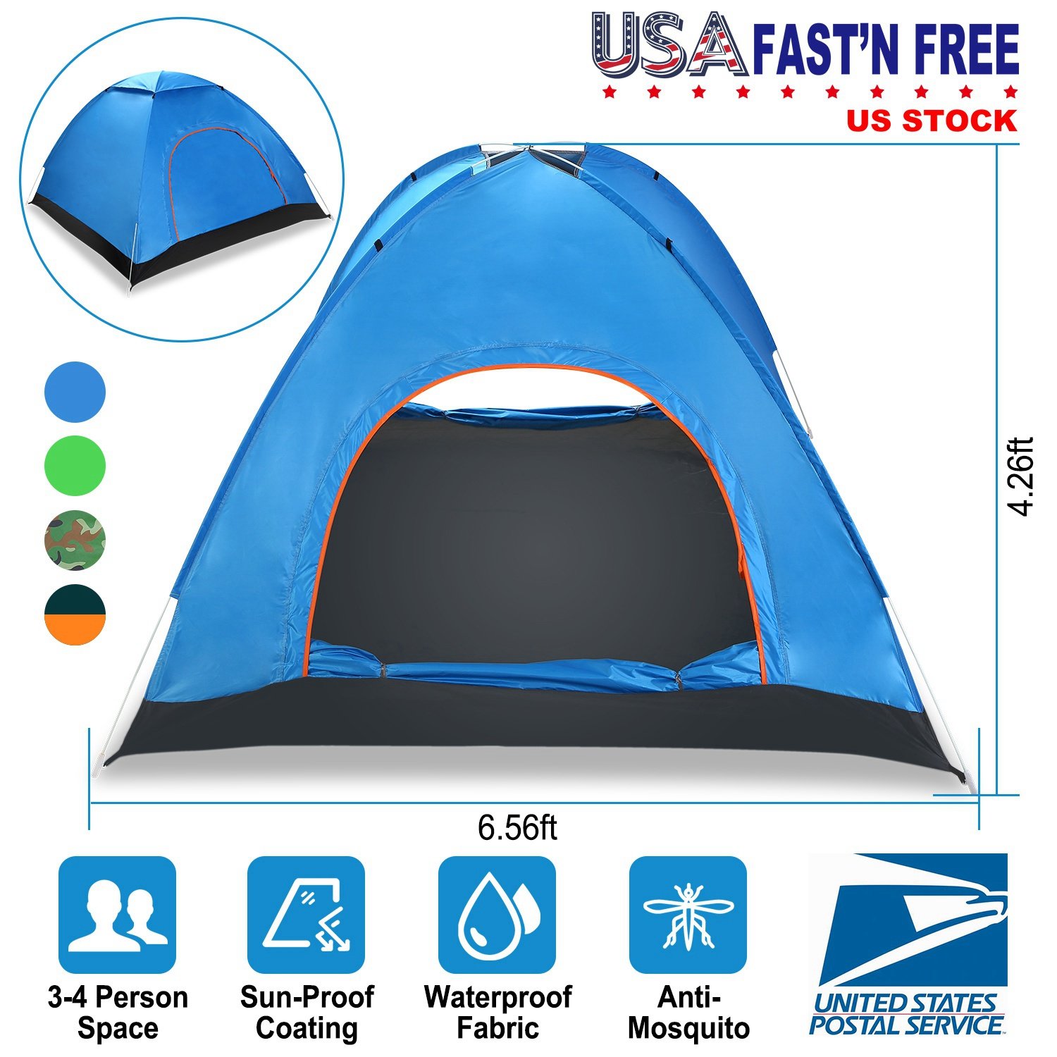 Our pop up tent which integrates with high-grade 170T coating polyester fabric body, moisture-proof oxford fabric floor pad and sturdy glass fiber frames is especially designed for various outdoor activities such as camping, hiking, fishing, self-driving tour, picnic, etc. Its unfolding size-6.56ft (length) x 6.56ft (width) x 4.26ft (height) provides large and spacious space to contain 3-4 persons (2-3 adults or 4 kids). And in order to better protect your privacy, create a more comfortable sleeping environment especially in summer, and ensure excellent air circulation, it is designed 2 symmetrical doors/windows with shade cloth and mosquito net to effectively block light, keep the inserts away and promote air flow. Additionally, it comes with a round carry bag to organize the folded lightweight (26.38in x 26.38in x 4.72in, only 3.04lbs) tent.