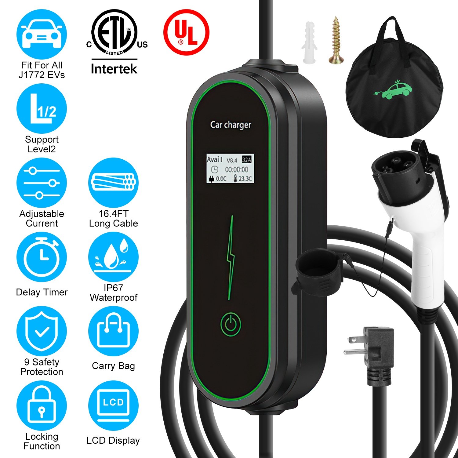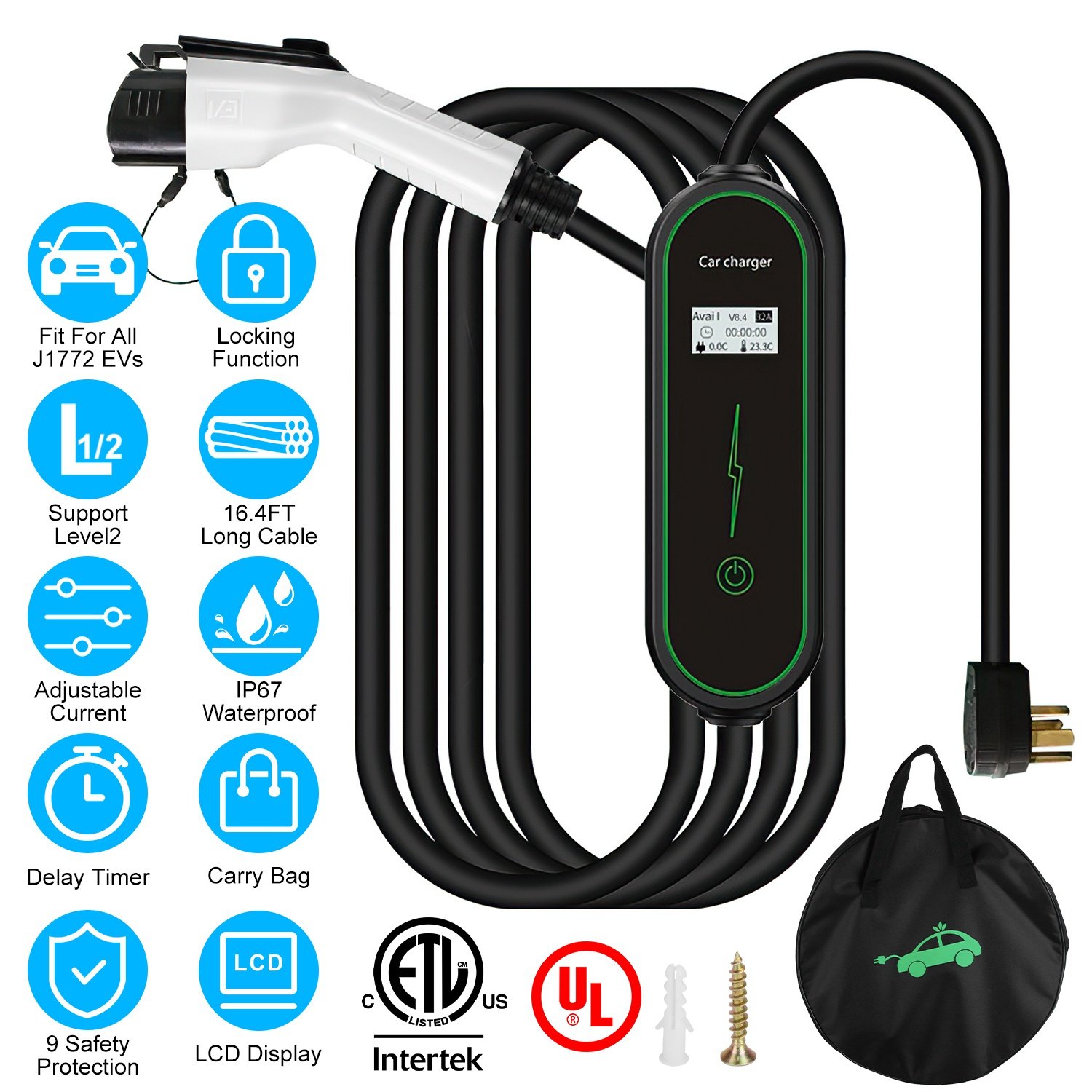 Take the Level 2 EV Charger home and enjoy the ultimate EV charging experience. Equips with a NEMA 6-20P plug(Level 2, 240V), suitable for all EV cars and plug-in hybrids with J1772 standard socket. Provides a quicker charging and achieves a range of 18.64 miles in just 1 hour. You can adjust the current and delay charging time freely as needed to suit your different charging needs, save your electricity costs and mitigate peak loads. A LCD screen can display all the important information, including current charging rate, voltage, delay charging time, and current temperature. Besides, it features excellent protections including 9 safety protections, anti-theft locking function and IP67 waterproof performance. Comes with a portable carry bag and 16.4ft long cable, easy to take it outside for travel and charge your car anytime anywhere conveniently!