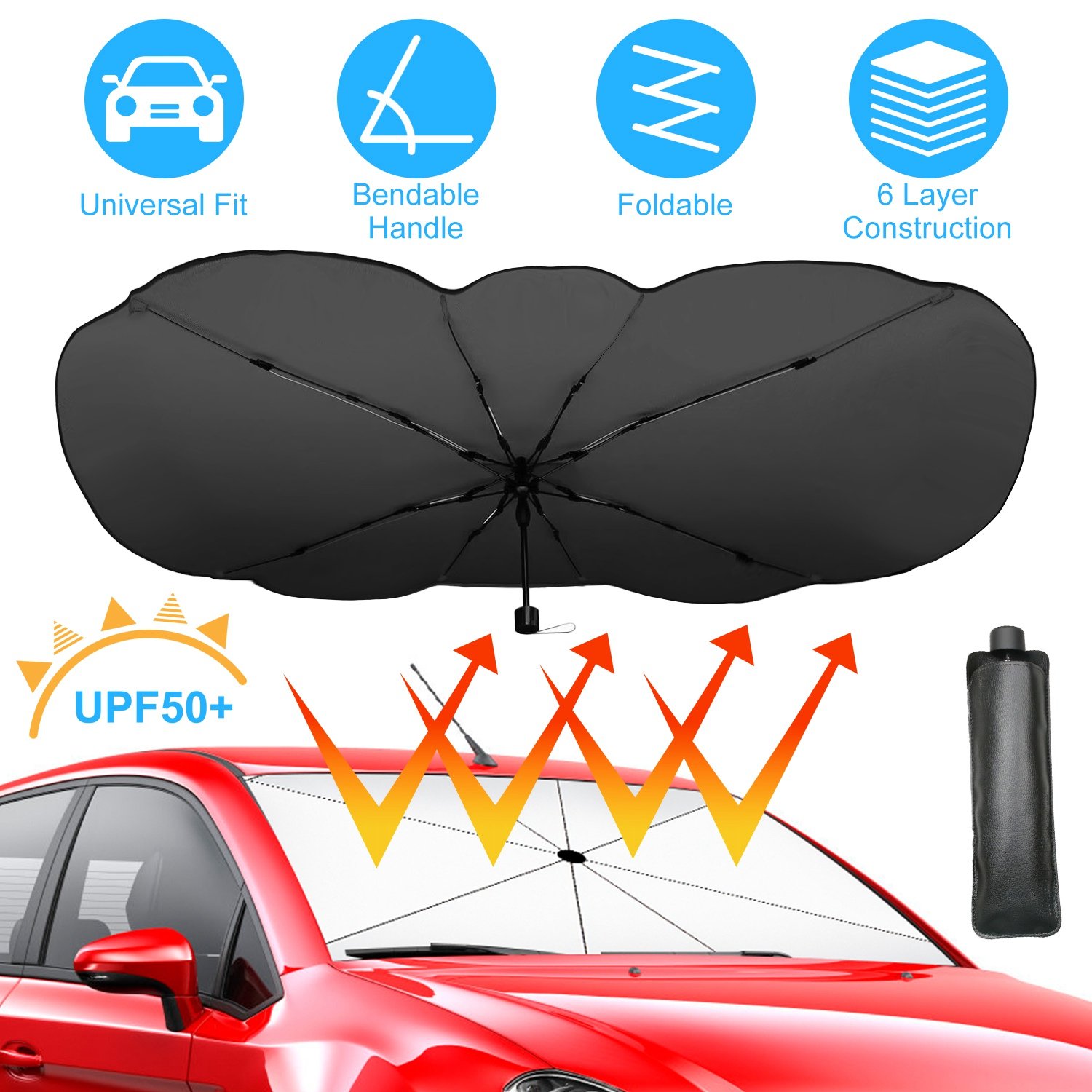 Made of premium Silver Titanium with 6 layer construction, our UPF50+ car sun cover windshield can block 99.99% UV rays, protecting the car interior and keeping it cool. Adopting umbrella structure, the car sun cover is easy to fold in seconds. Come with a carry bag, easy to carry. Also pair with 8 glass fiber rods, not easy to break. The handle is bendable for easy usage. 57x33In universal size for all car types, such as compact car, pickup truck, sedan and SUV etc.. Easy to use. A must-have for car owners!