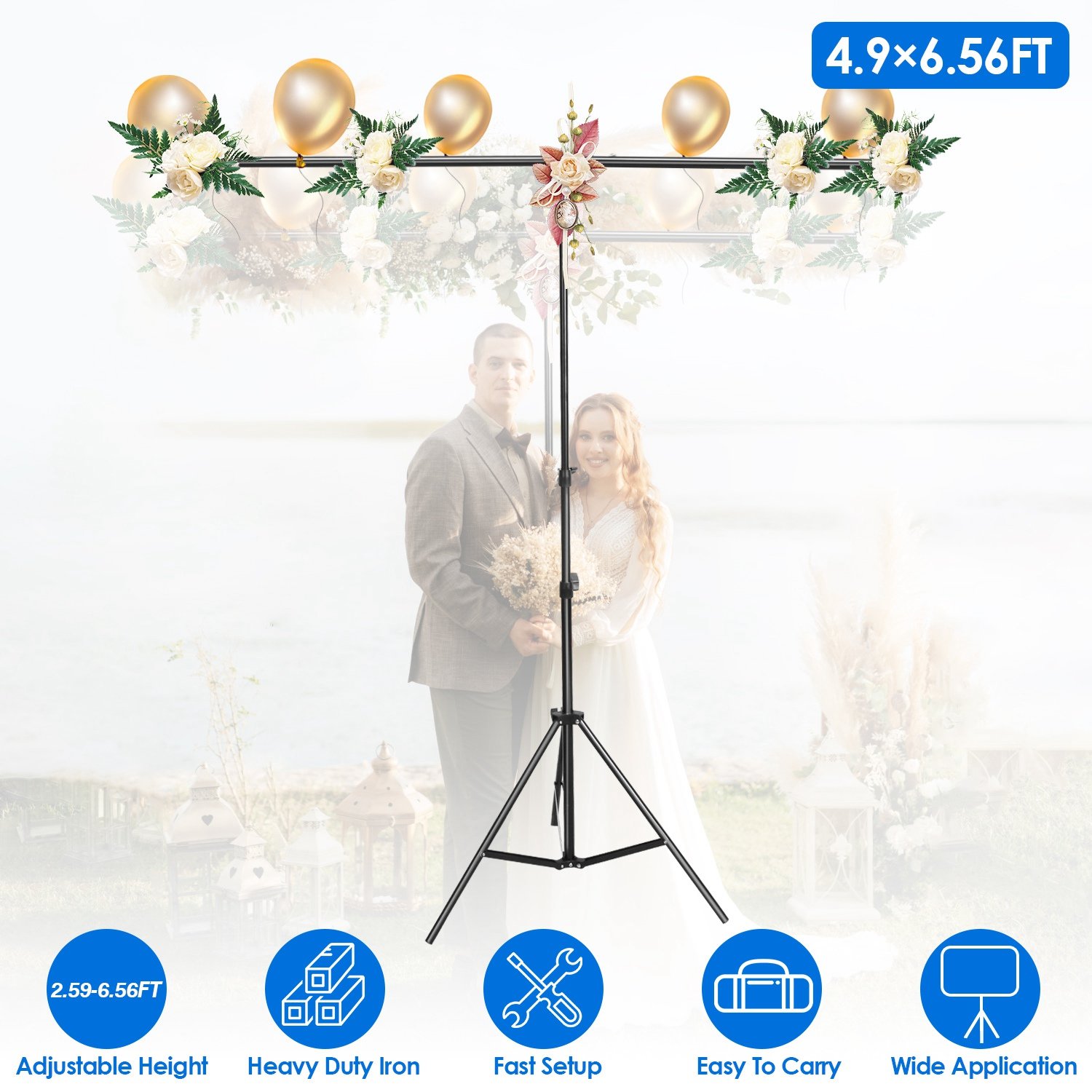 Looking for a portable backdrop stand for your photography or live streaming setup? Crafted from sturdy iron, this 5×6.5ft T shape backdrop stand is durable enough to hold backdrops within 3kg/6.61lbs, ensuring them stay in place throughout your shoot or event. Offer an 2.59-6.56ft adjustable height catering to diverse shooting needs. The 6Pcs spring clamps grip canvas, muslin or paper backdrops tightly. Suitable for live streaming, photography studios, weddings, and parties. Easy to assemble and disassemble. Come with 1 sandbag and 1 carry bag for easy storage and transporting. Upgrade your photo or video studio today with this portable backdrop stand!
