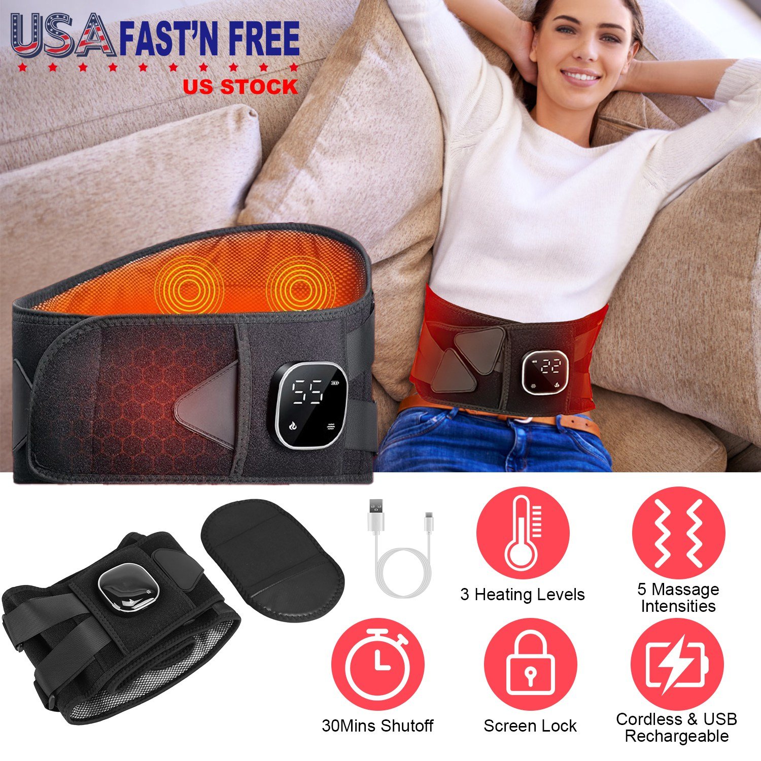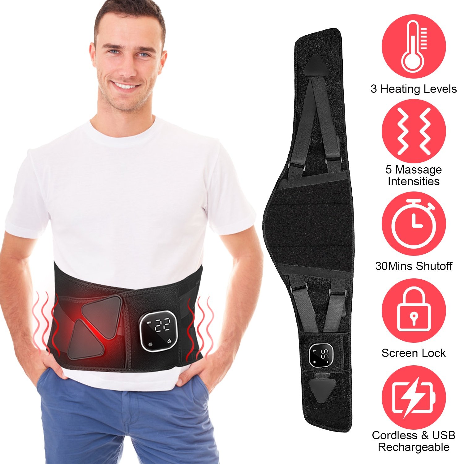 Do you always feel tired or ached? With the 3 heating levels(149℉/131℉/113℉) and 5 additional massage intensity levels, our lower back massager heating pad provides soothing warmth and comfort to our lower back and belly. The 3 support poles hold your spine well in place and provide strong support for your lower back. Help you relieve the pressure on the back and maintain proper posture. Fast heat up for 3S and auto shut off for 30 minutes for safety. Come with an extension pad, fit for all waist. Cordless and USB rechargeable, easy to carry everywhere. Digital display, easy to read and use. An ideal gift for our mother, father, lover and colleague etc..