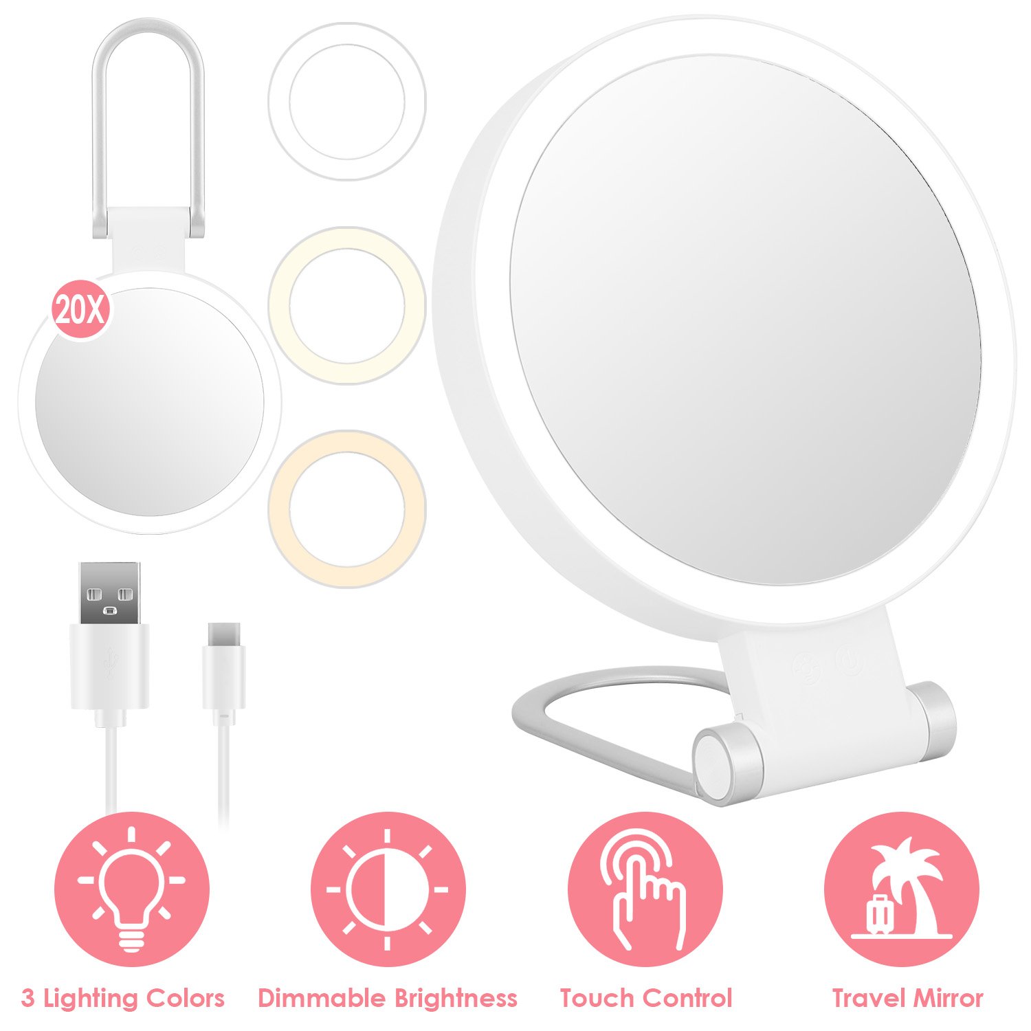 Home > 20X/1X Double-Sided Magnifying Makeup Mirror With Light Rechargeable Travel Makeup Mirror With 3 Colors Dimmable Brightness Adjustable Stand Vanity Ta