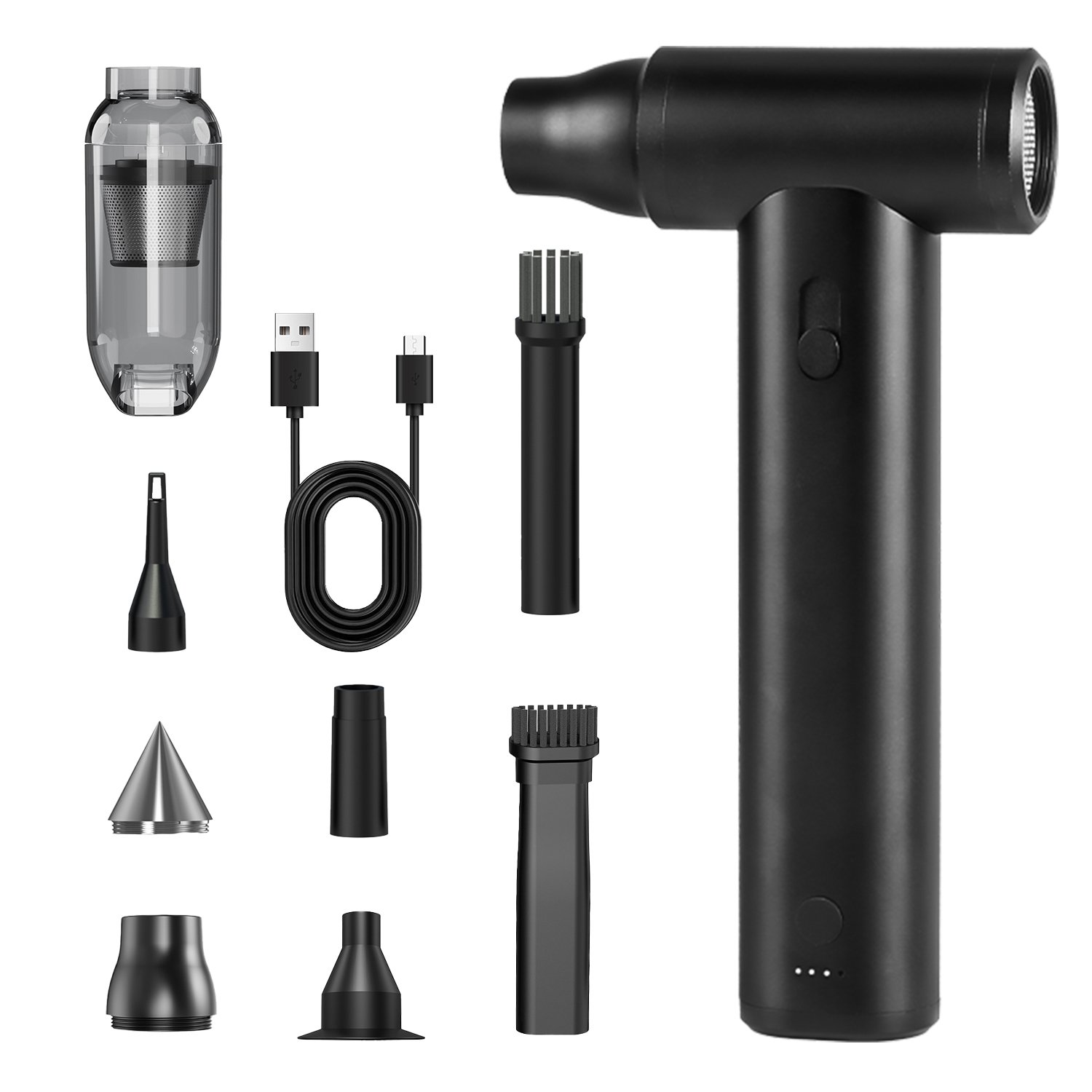 Equipped with powerful brushless motor, our innovative compressed air duster with 18Pcs accessories is designed for all your cleaning demands. The front end delivers strong airflow for blowing away dust and debris, while the rear end is for vacuum cleaning and extraction purposes. Reaching up to a maximum rotate speed of 250,000 RPM, high-speed airflow generated by this cordless dust blower thoroughly and deeply removes debris from even the tightest crevices. Suitable for cleaning keyboard, laptop, camera, car seat, blind cleaning as well as inflating airbeds, lifeboats, pool floats or starting fires at picnics.