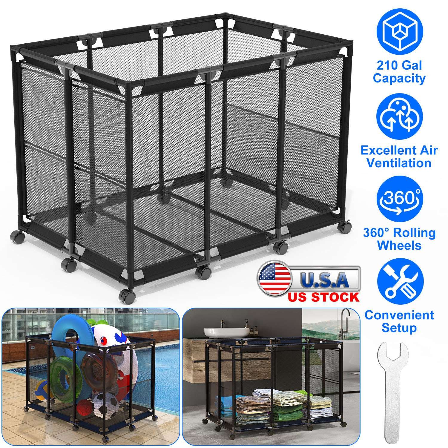 Our 210Gal spacious pool storage bin is a best choice for you to store all your swimming accessories at home! Constructed with heavy duty iron tube and mesh basket, great to store water balloons, surfboards, swimming rings, noodles, floating beds at ease and make the accessories dry quickly and avoid mold and odor thanks to its excellent air ventilation. Also designed with 6 side pockets for small items. Easy to move it to anywhere conveniently with rolling wheels and keep it standing in place by locking 4 lockable wheels. Easy to assemble with no other tools needed for quick using. Perfect for family pools, public pools, aquatic activity centers and other places that need to be organized.