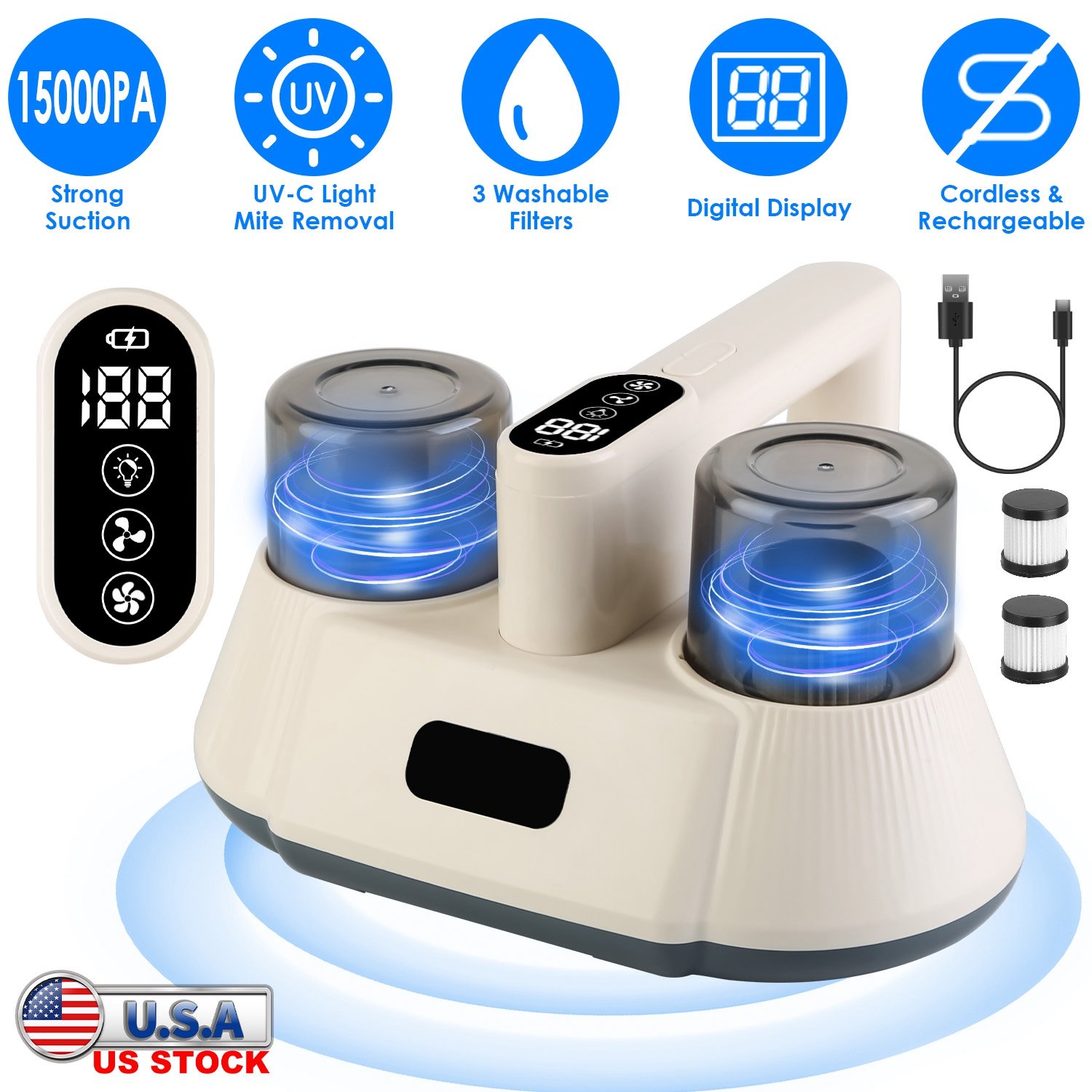 Home > 15000PA Double-Cup Bed Vacuum Cleaner with UV-C Light Cordless Mattress Vacuum Rechargeable Dust Mites Remover with 3 Washable Filters