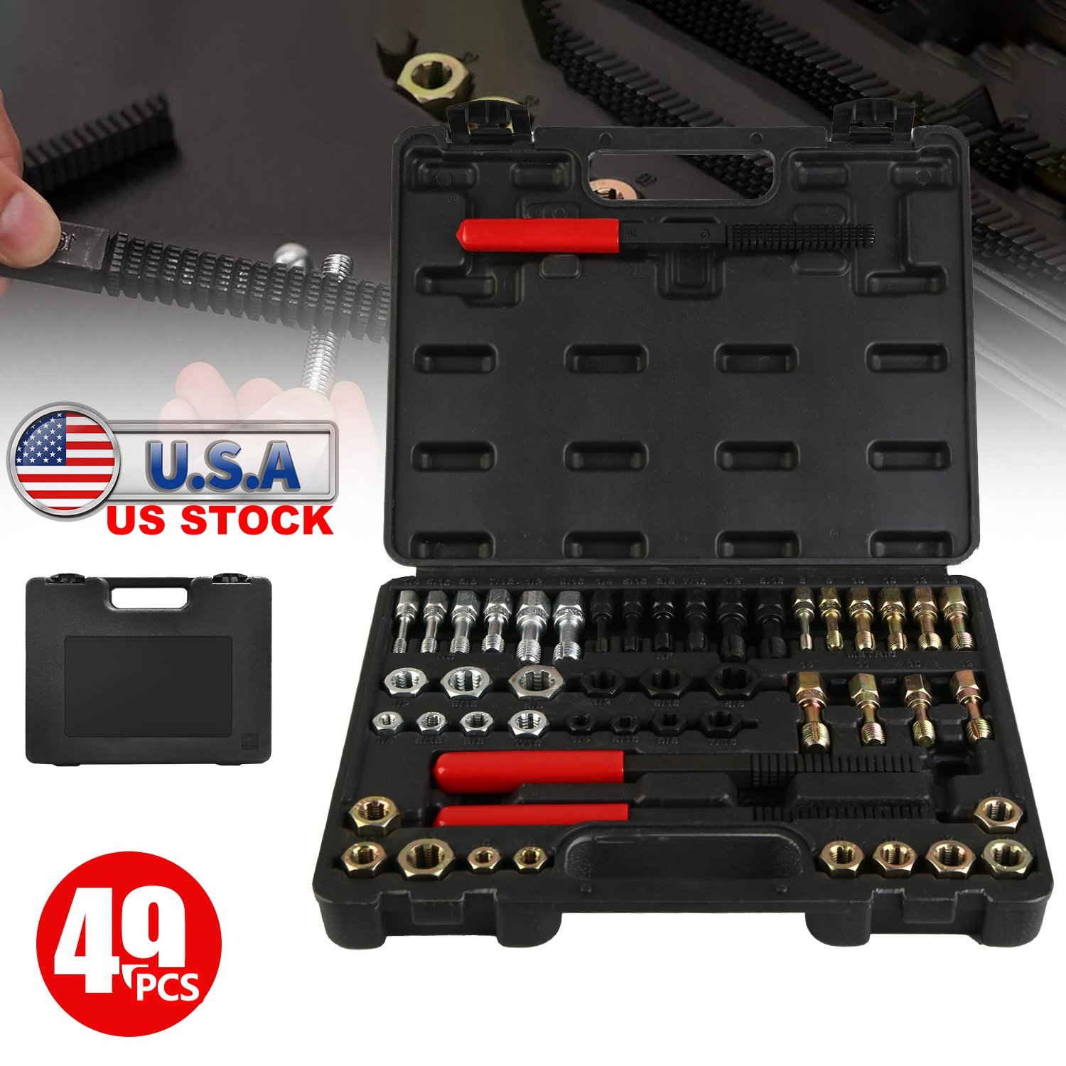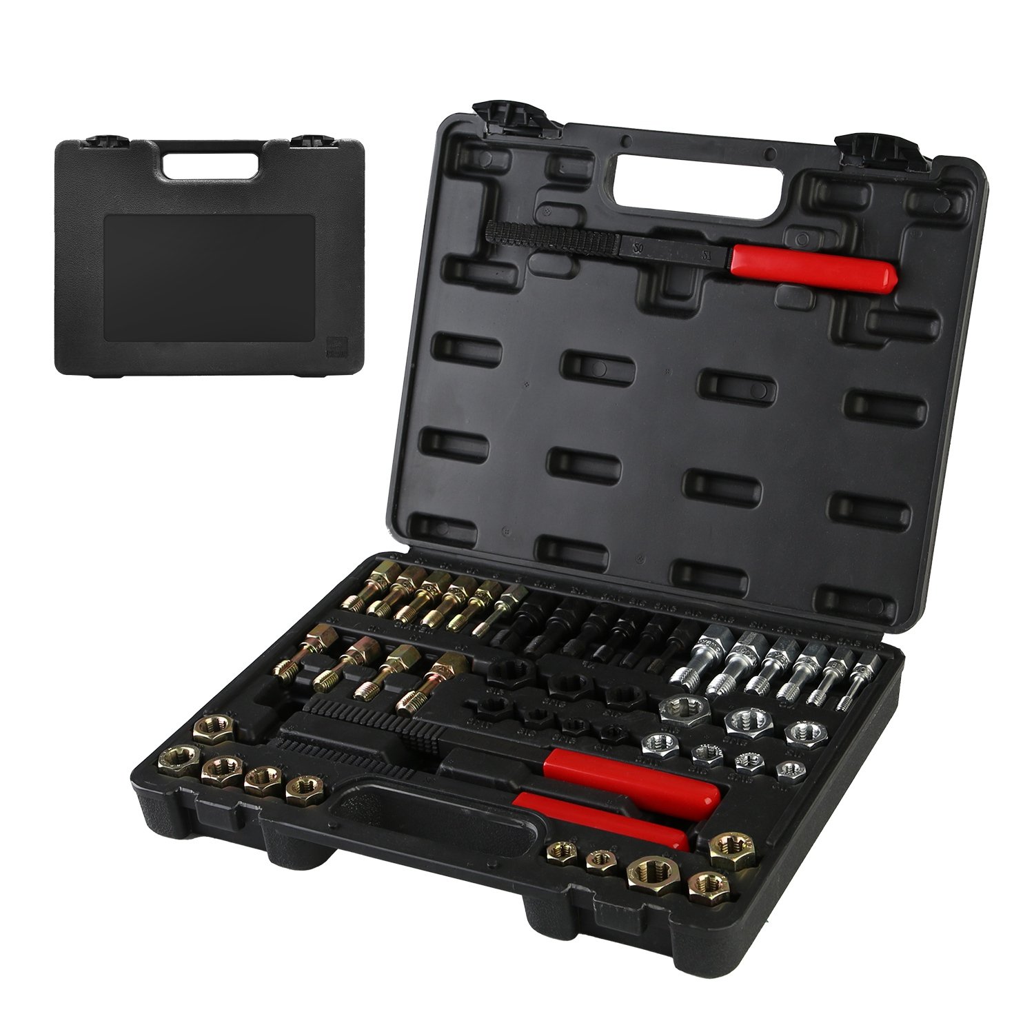 Our 49Pcs Metric and SAE standard Thread Repair Chaser Tool Set is a good choice for you to repair any worn, damaged, rusted threads effectively and can serve as a thread repairer and cleaner, removing stubborn dirt and corrosion without affecting metal integrity. A must-have tool for every auto mechanic. Its sturdy Bearing Steel and 40Cr Mold Steel material are strong and sturdy enough to ensure durability for long lifespan. Easy to organize in a portable carry box with handle and convenient to recognize each coarse, fine, metric, and SAE chasers and dies instantly and access to anything you need more conveniently thanks to the clear specification marks on the placement holes. Your comprehensive toolkit for every rethreading need!