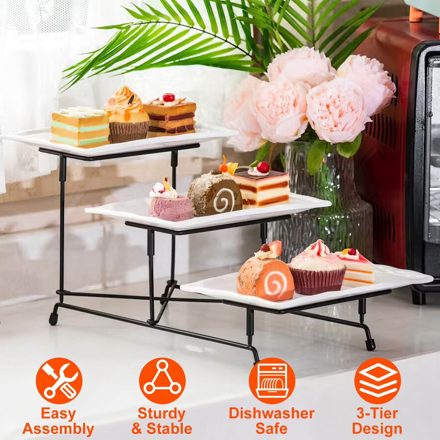 3-Tier Plastic Serving Tray Dessert Server Display Serving Stand Dinnerware with 3 Rectangular Plastic Serving Platters Metal Stand for Entertaining F