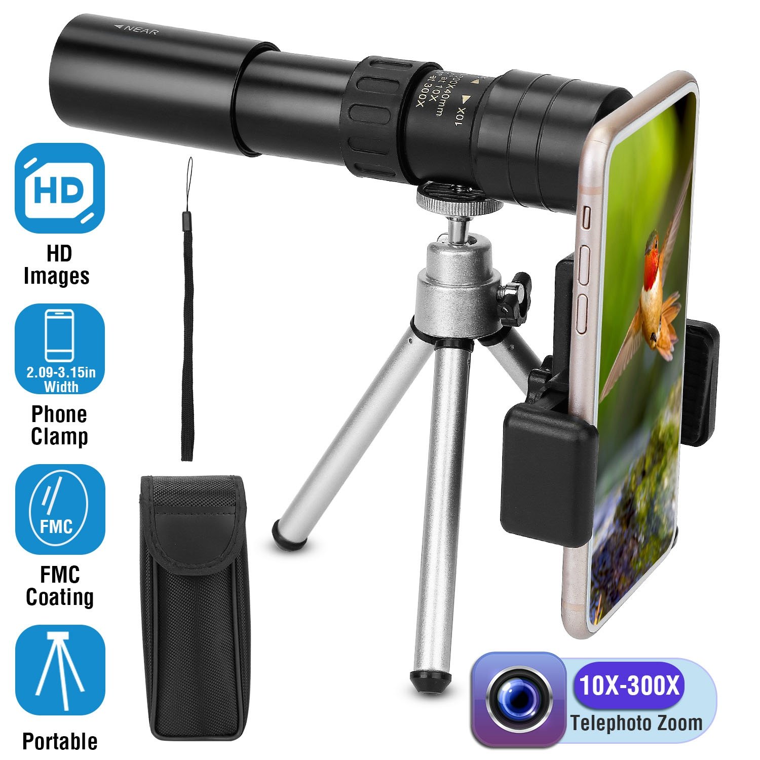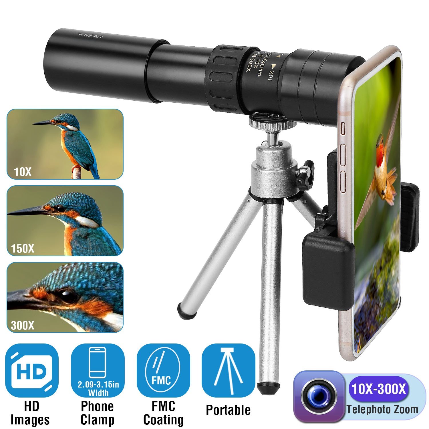 Home > 10X-300X Zoom Monocular Telescope High Definition Phone Telephoto Lens w/ Phone Holder Clamp Tripod For Hunting Hiking Sightseeing