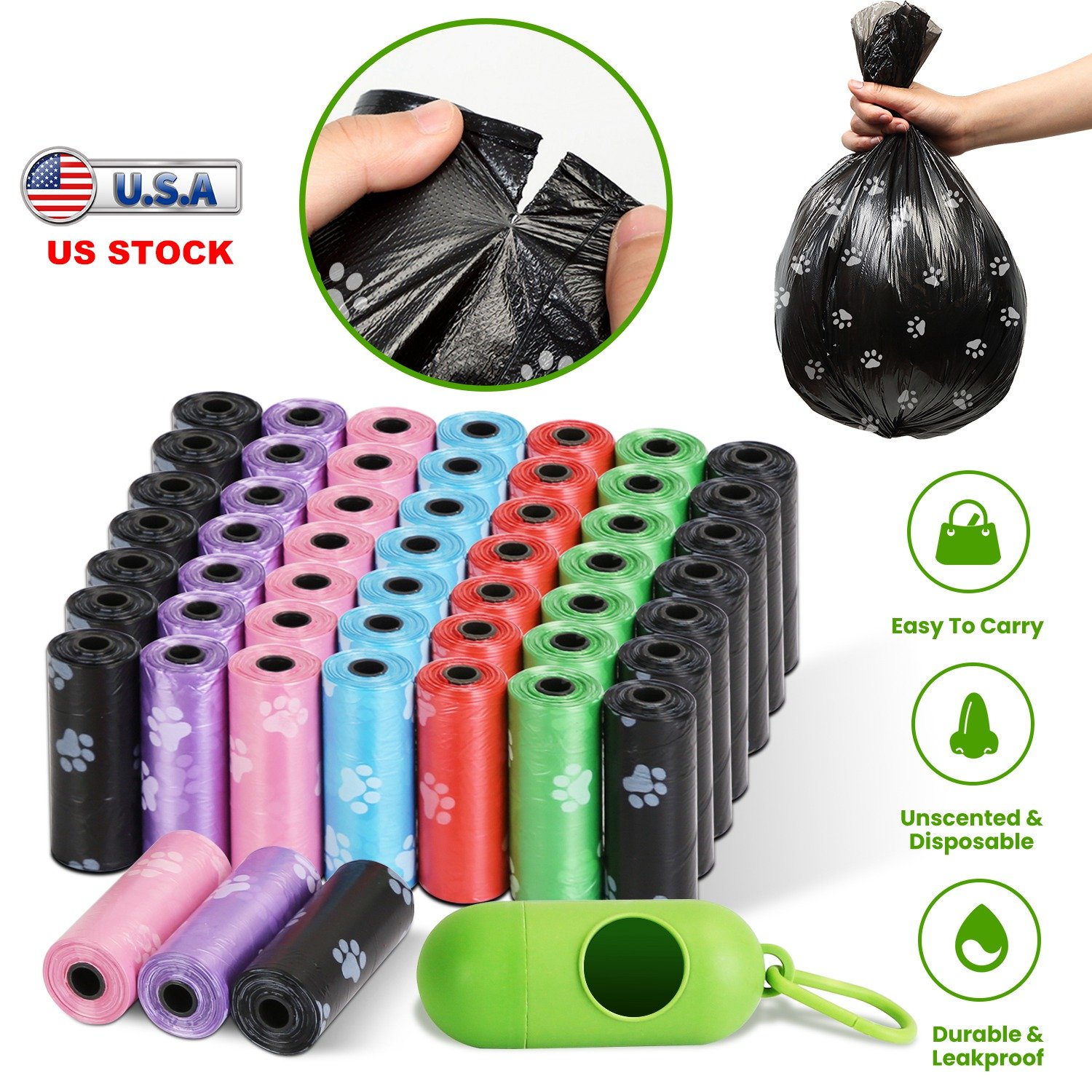 Have you ever been in an awkward situation when your for-legged friend poops at the park or on the road? Our dog waste bags is an optimal solution for such dilemma, 100% leakproof and easy to tear open. Come in 45 rolls, 675 count in total, enough amount to last about 11 months, 2 bags per day. We offer a dispenser for waste bag refilling. The carabiner makes it easy to carry when dog walking. The dispenser also has an outlet for you to taking out bag easily. Made of premium PE, durable and unscented, suitable for pet owners.